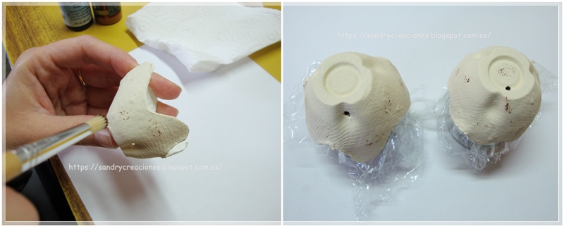 Para darle el toque final cogemos un pincel seco con pintura marrón oscuro al que le sacamos el exceso de pintura en un papel y le hacemos puntitos para simular la textura y el color de las cáscaras de huevo.