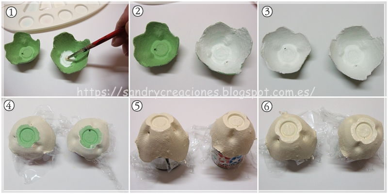 Seguidamente pintamos las dos partes de la cáscara por dentro de color blanco y por fuera de color crema realizado mezclando pintura de color blanco y un amarillo vainilla:
