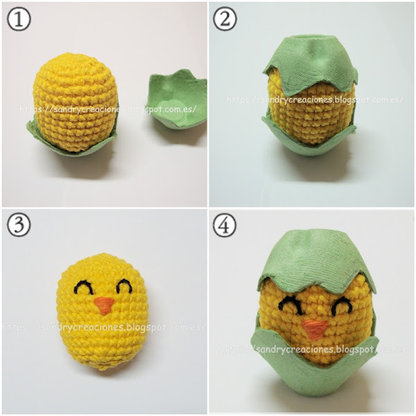 Aunque ya hemos dejado atrás la Semana Santa hoy venimos con otra idea que podía servir para Pascua y que si bien no la podéis realizar para este año seguro os será de inspiración para el próximo año para el día de Pascua o para cualquier otra utilidad. Un pollito con cáscara, es decir, a medio salir de su cascarón .