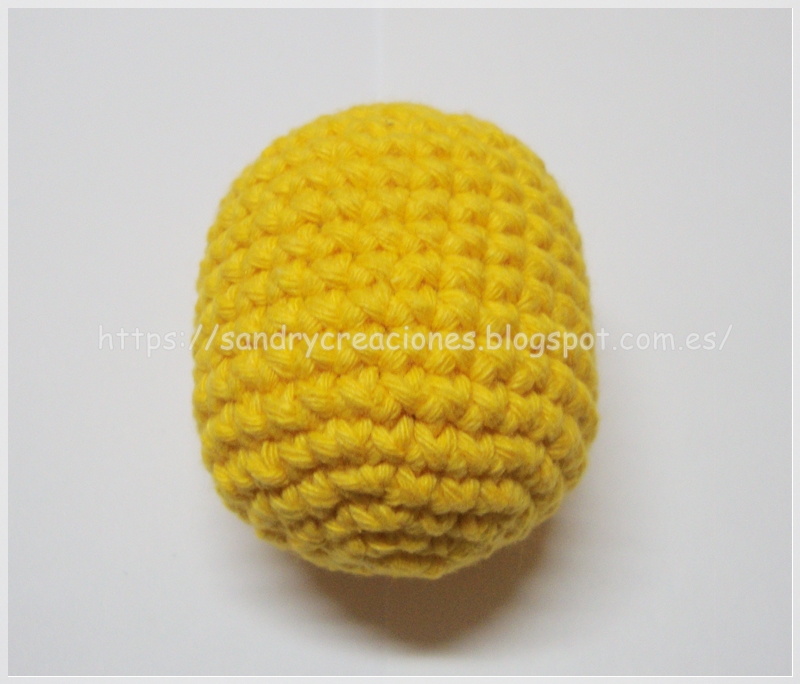 Así que ahora realizaremos el pollito a crochet o ganchillo con el hilo amarillo y una aguja de crochet de 2,5 mm siguiendo el siguiente patrón: