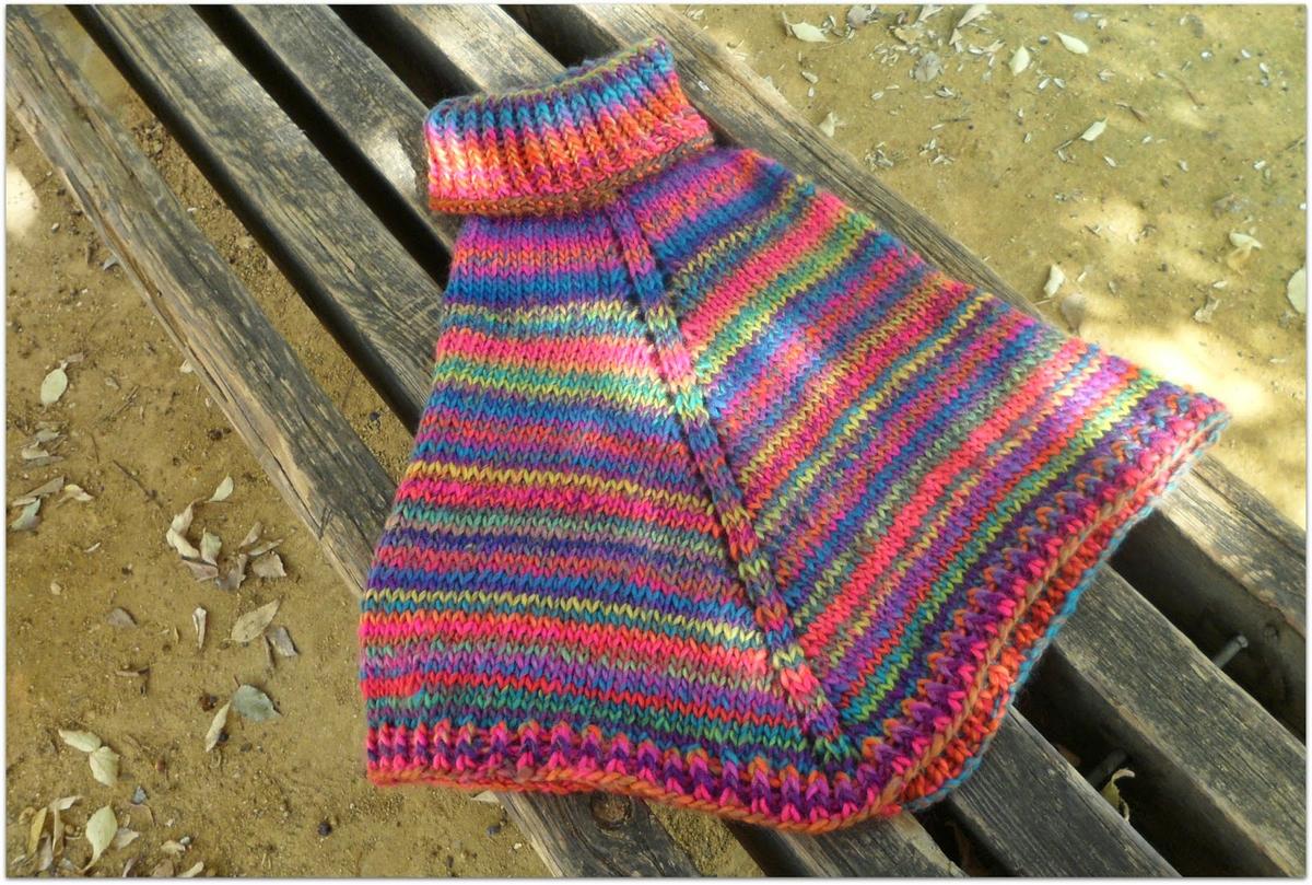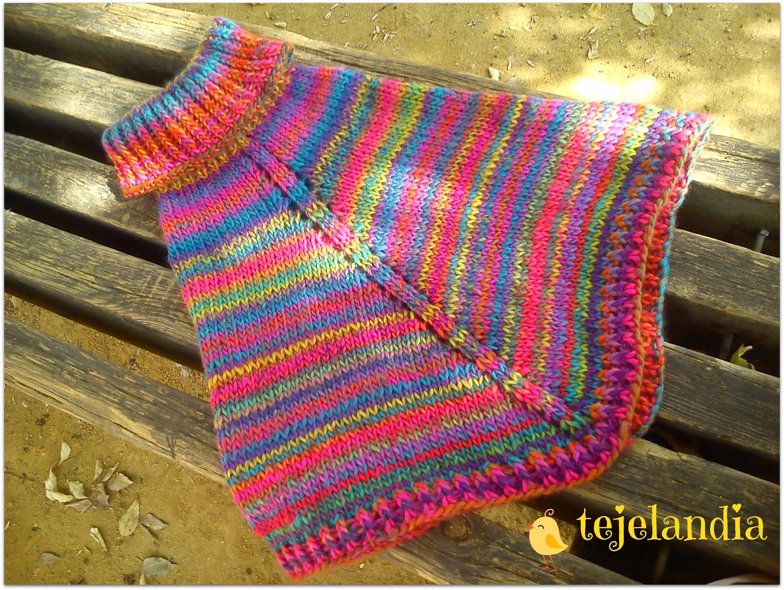 Este es mi poncho arcoiris. Fácil, sencillo de hacer con las agujas circulares. Hace un pico en la parte central tanto en el delantero como el parte de atrás. Los picos puedes ponerlos así o cada uno hacia un hombro para darle un toque distinto al poncho.Yo lo he hecho con cuello alto porque soy muy friolera y necesito tener el cuello abrigado .