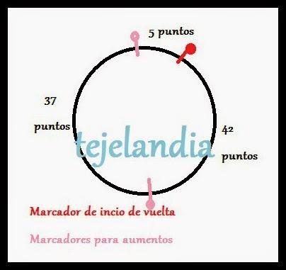 Los aumentos los haremos echando una hebra. ¿dónde? antes y después de los marcadores (excepto en el de inicio).¿cómo? un punto antes del marcador, echamos hebra, tejemos un punto derecho y pasamos marcador.Hago un punto derecho, echo hebra y continuamos tejiendo del derecho hasta que nos encontremos el siguiente marcador, en el cual, repetiremos la misma operación.