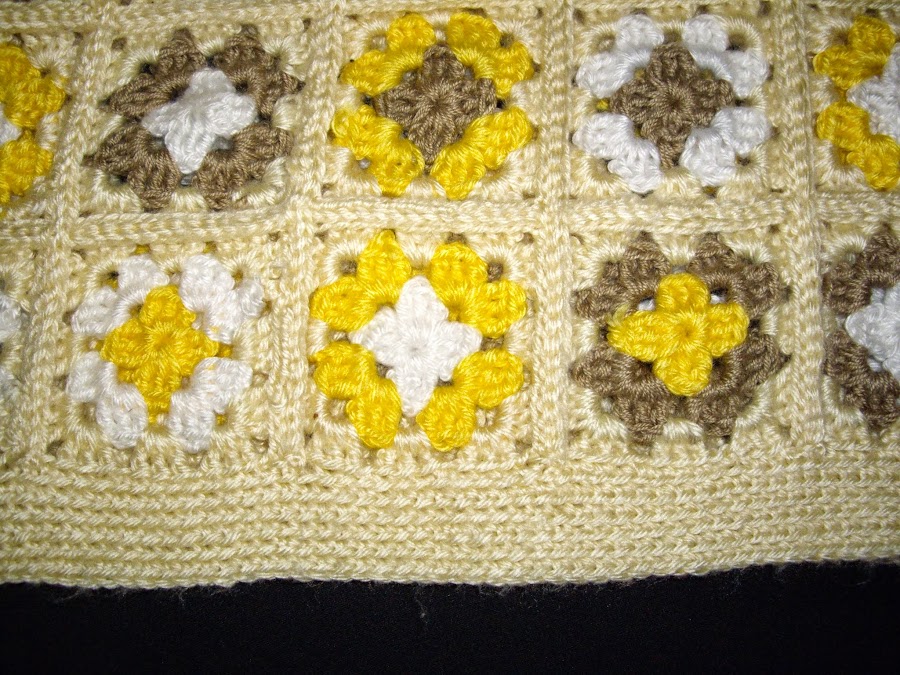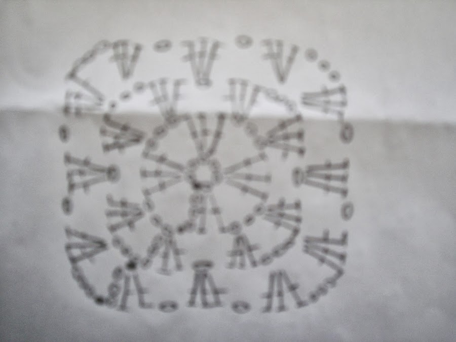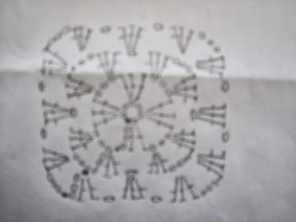 Este es el grafico que muestra como se realiza cada cuadrado...Perdon..., pero la foto no salio muy clara, hay que realizar seis cadenitas, las cuales se unen formando un circulo, luego se tejen cuatro grupos de tres varetas dobles cada uno separados cada grupo entre si por tres cadenas, la siguiente vuelta vamos a tejer en lo que seria cada esquina de nuestro cuadrado dos grupos de tres varetas dobles cada uno, y separados entre si por tres cadenas, ojo, que en los laterales cuando unimos un grupo de varetas con el otro va solo una cadena, y la tercer vuelta se hacen en las tres cadenas dos grupos de tres varetas dobles cada uno, luego se hace una cadena, otro grupo de tres varetas dobles, otra cadena, y nuevamente dos grupos de tres varetas cada uno, separados por tres cadenas, asi continuamos para formar nuestro cuadrado......Espero que se entienda, no se que es lo que esta mas claro si el dibujo o mi explicacion, jajajajaa!!!