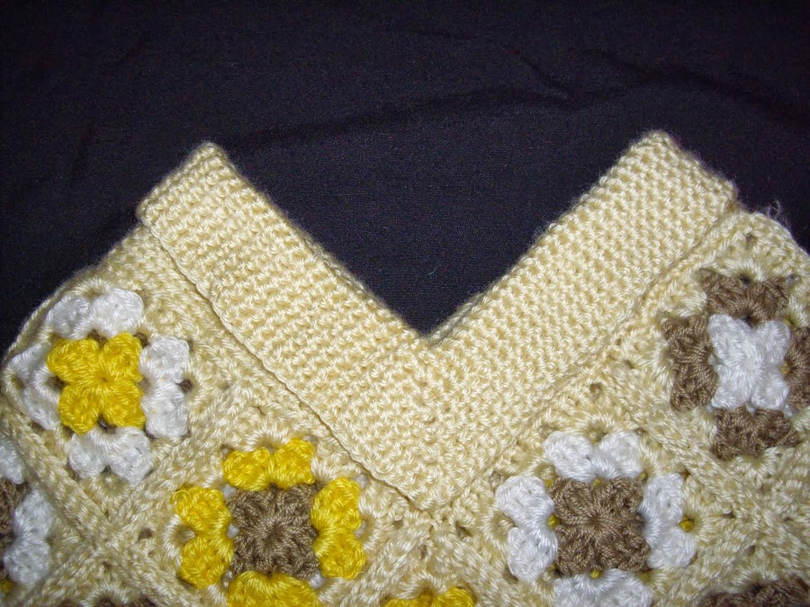 Todo el borde del poncho lo hice con 6 vueltas de medio punto, en cada vuelta le agregue dos puntos en las esquinas , y como el poncho quedaba un poco escotado para mi gusto, le hice un cuellito con medio punto ( esto es opcional ) .