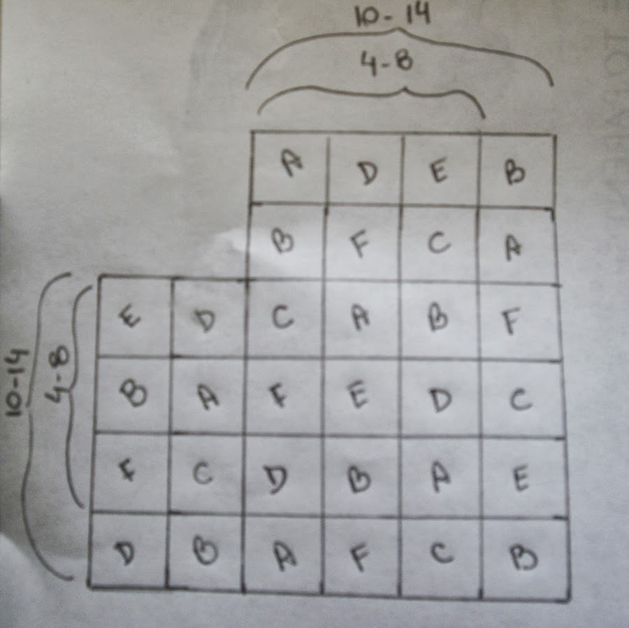 Esta tabla es para que sepan la cantidad de cuadrados que deben hacer de cada color, el numero que esta entre parentesis corresponde a la medida 10-14, y las siglas BL, corresponden al color blanco, M al marron, Be al beige y A al amarillo , o sea que el cuadrado A tenemos que realizar para el talle 4-8 , 8 cuadrados los cuales van a tener en la primer vuelta color blanco, en la segunda color marron, y en la tercera beige .
