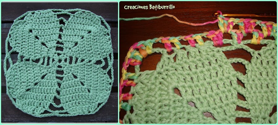 Sobre cada trébol vamos a continuar tejiendo un cuadrado.La primera vuelta formada por grupos de "2 puntos altos, 2 cad al aire" separadas como veis en la foto para cubrir todo el contorno del trébol. La esquina también 2 puntos altos, 2 cad, 2 puntos altos.
