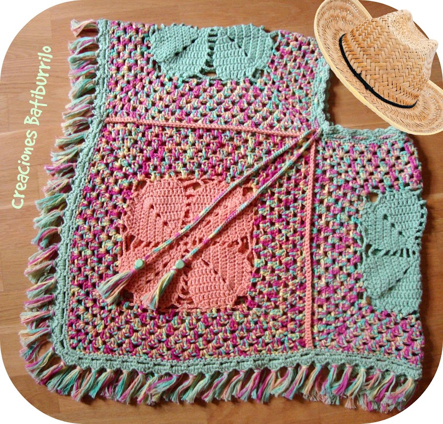 La estructura del poncho parte de los 4 tréboles, 2 en verde y 2 en naranja, cuyo esquema tutorial podéis revisar AQUÍ. Compré más hilo del mismo algodón pero multicolor, incluyendo los tonos verde y naranja de los tréboles centrales. Ganchillo de 4,5 mm.