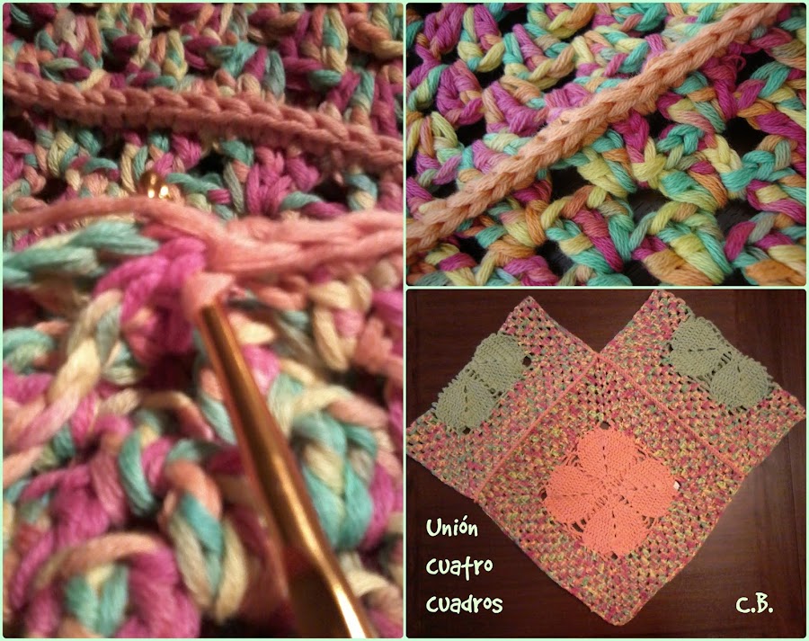 Una vez finalizados los cuatro cuadros, los uní con el mismo ganchillo y el hilo naranja para dejar un contorno a la vista.