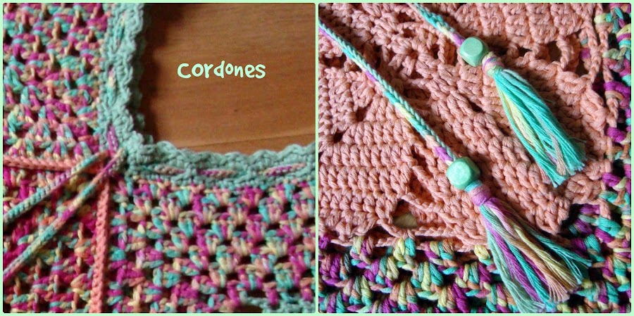 Como colofón en toda la parte inferior, no podían faltar los clásicos flecos.Las hebras se cortan del mismo tamaño con ayuda de un cartón, las juntamos en montoncitos, doblamos por la mitad, introducimos el bucle con ayuda de un ganchillo, lo extraemos desde el revés y pasamos el otro extremo de las hebras por dentro del mismo para apretarlas cerrando el nudo.