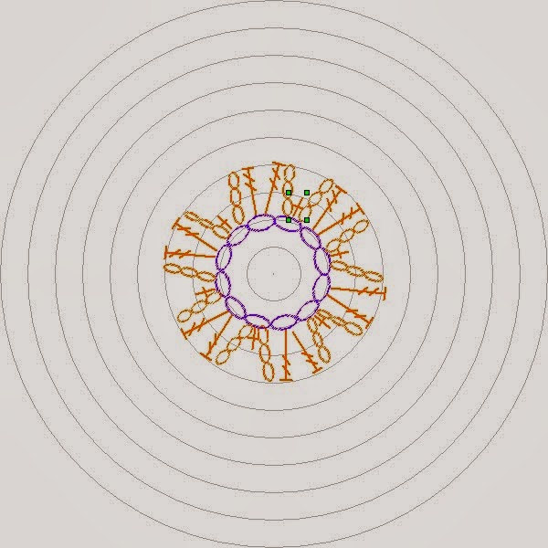 En un circulo mágico montar 12 cadenitas, alzar 3 cadenitas al aire, en el próximo punto hacer 2 puntos dobles y tres cadenitas al aire y punchar en la próxima cadenita con un punto bajo, alzar nuevamente 3 cadenitas...asi sucesivamente hasta completar seis pétalos.
