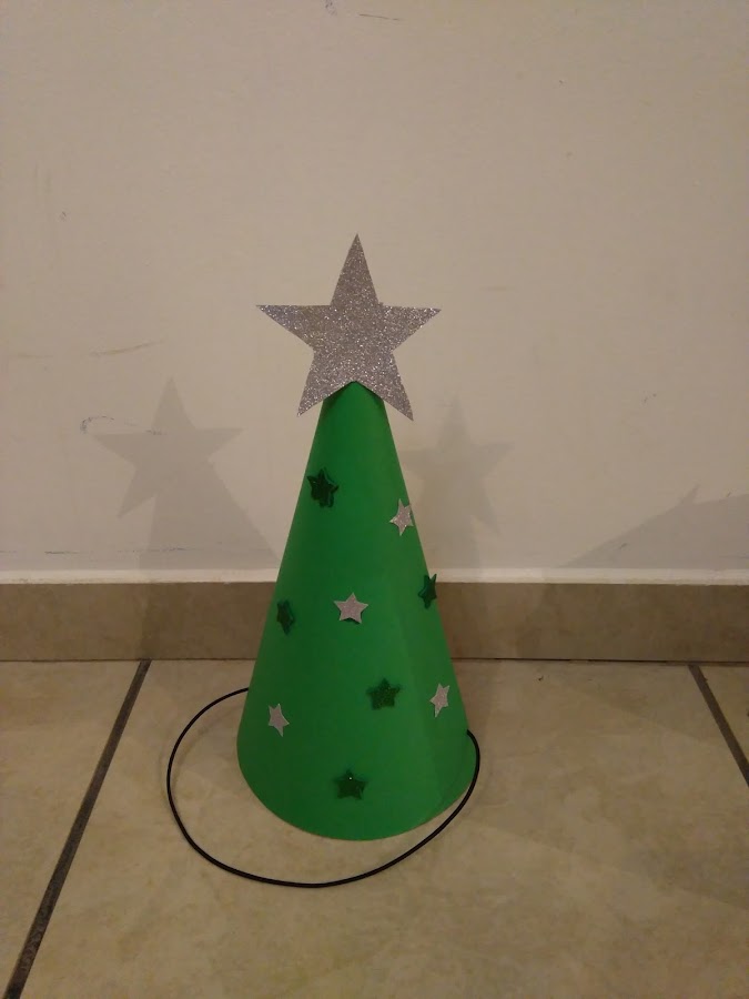 La última idea es para los más peques. Les haremos un disfaz de árbol de Navidad. Cómo? Pues con una cartulina verde. Tenemos que doblar la cartulina en forma de cono al tamaño de la cabeza del niño. Ponerle una goma para que no se caiga y por supuesto decorar. Éste es el que scraplowcost hizo para Nadia con mucha ayuda ;)