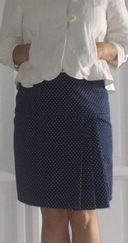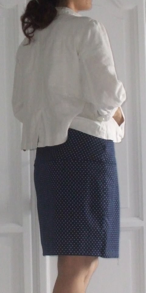 I messed it up with the instructions, had to ask for help, run out of fabric, had to hand sew almost every seam, but IT"S FINISHED AND HANGS BEAUTIFULLY IN MY CLOSET. Haven"t worn it yet, just waiting to find the right shoes for a navy short skirt.