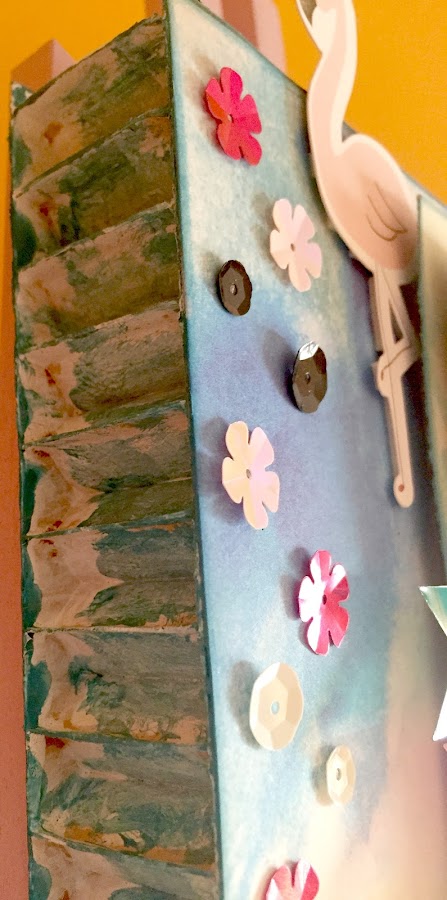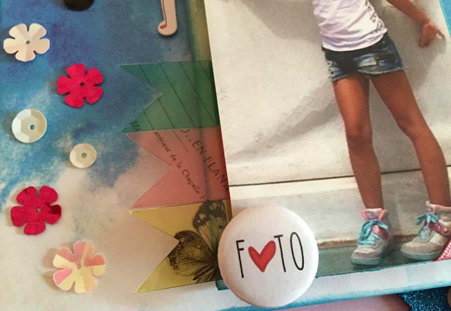 Los papeles son de la Colección Dream in Color de Websters Pages, el flamenco las banderolas y los sequins son de la colección Confetti de American Crafts. La chapita de Foto es de Yoy Scrap. Las esquineras de tela que le puse a la foto son de Dear Lizzy de American Crafts.