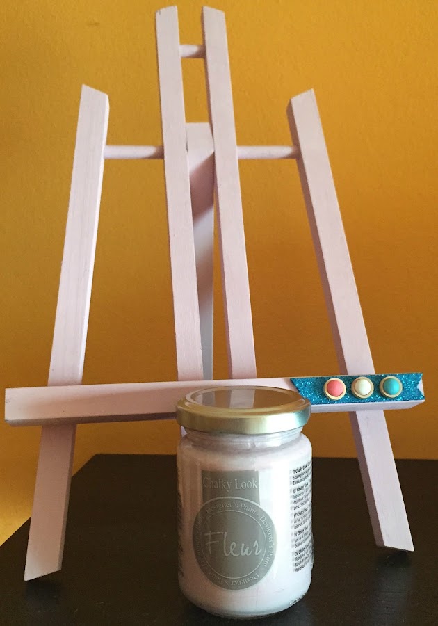 A juego le hice un caballete pequeño al que lo pinte con pintura acrílica de tiza de color Babydoll Silk de la casa Fleur que me encantan el resultado que dejan esta marca y le añadí una pequeña decoración de una tira de madera de la colección DIY Shop de American Crafts a la que le añadí embossing con polvos de purpurina azul también de American Crafts y tres maderitas redondas de colores que tenia sueltas por el estudio.