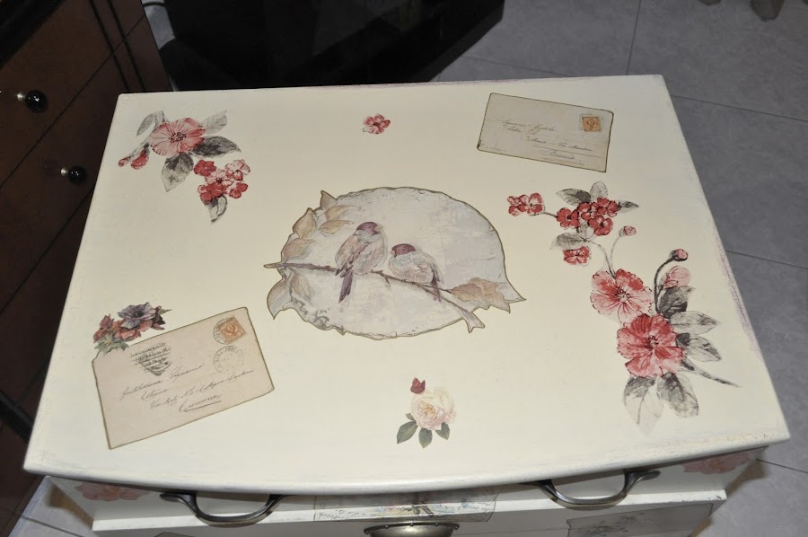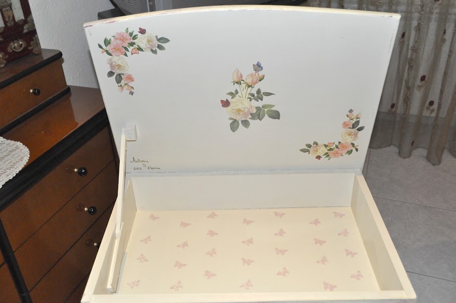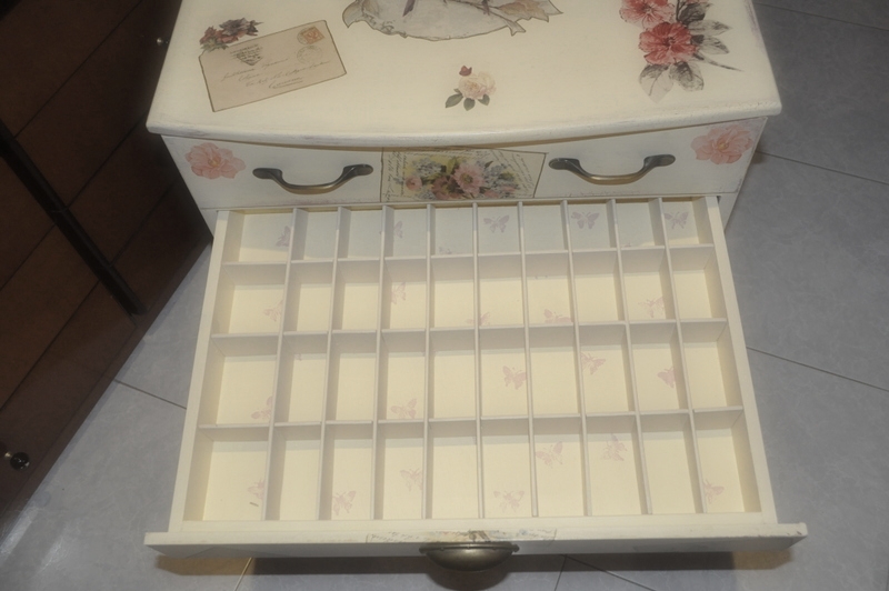 En los cajones y el costurero,con ayuda de un botón de foamy en forma de mariposa estampé en rosa flojito el fondo de los cajones y costurero para que no quedara tan soso,la verdad que me encanta como ha quedado.