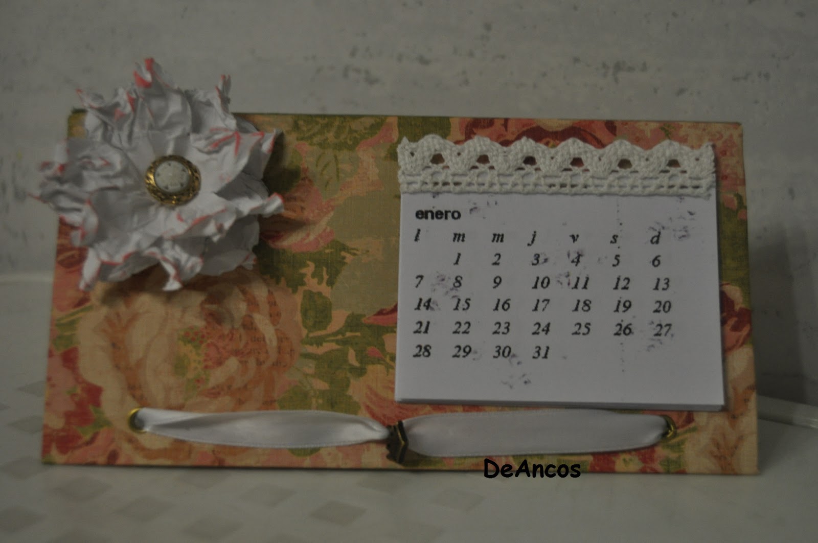 He escogido un papel que me encanta de rosas del taco-papeles en tonos rojizos contrastando los adornos en blanco. He adornado el mensuario con una puntilla adhesiva y he puesto a su lado una flor de las que enseñó a hacer Goyi con un botón regalo de Luisa Fernanda. En la cinta de raso que sujeta la estructura he conseguido colgar una corona con las palabras Princess. Faltaría más para mi propio calendario, jajaja