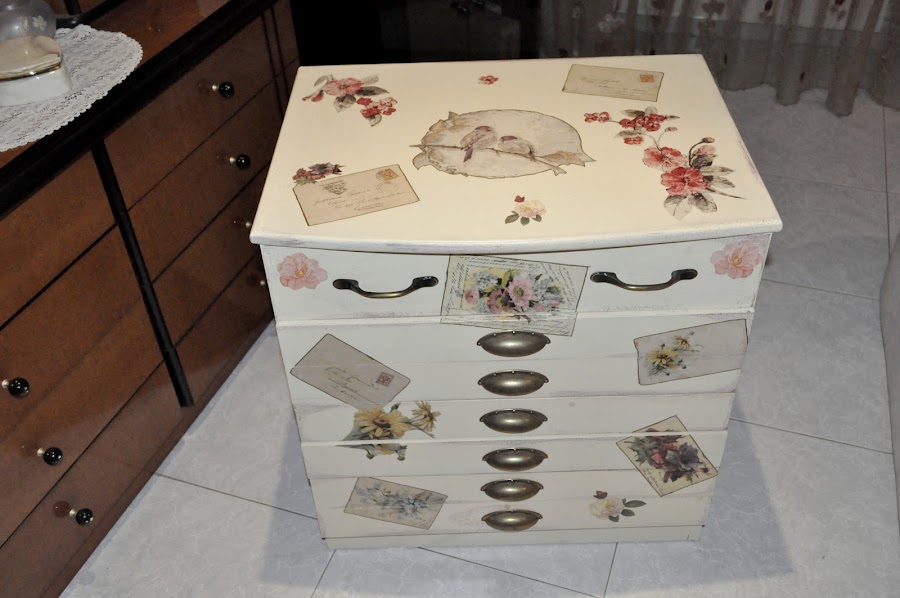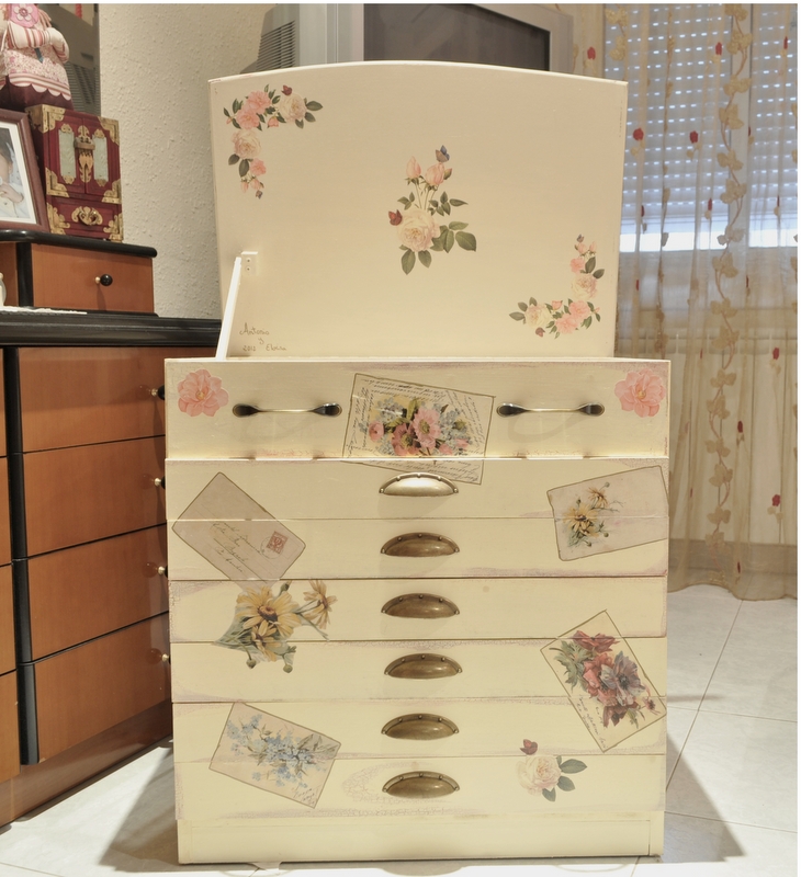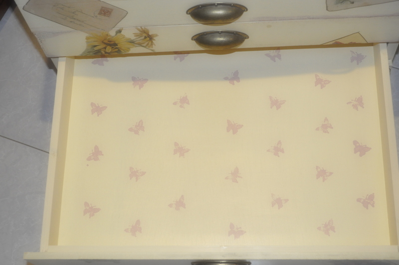 En los cajones y el costurero,con ayuda de un botón de foamy en forma de mariposa estampé en rosa flojito el fondo de los cajones y costurero para que no quedara tan soso,la verdad que me encanta como ha quedado.