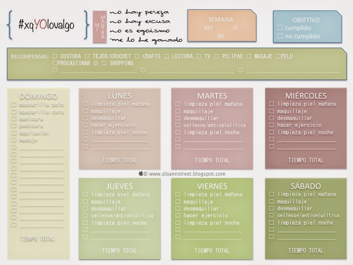 En un estudio reciente se ha puesto de manifiesto que las mujeres trabajadoras disponemos de 54 minutos al día para nosotras y las mamás que trabajan en casa no llega ni a los 90 minutos. Así que ya que, por desgracia, no vamos a conseguir días de 48 horas, ¿qué mejor que organizarnos esos pocos minutos? Y para ayudaros en esta "empresa" os he preparado un imprimible que os podéis descargar de forma gratuita pulsando aquí.