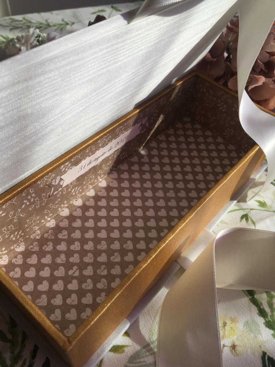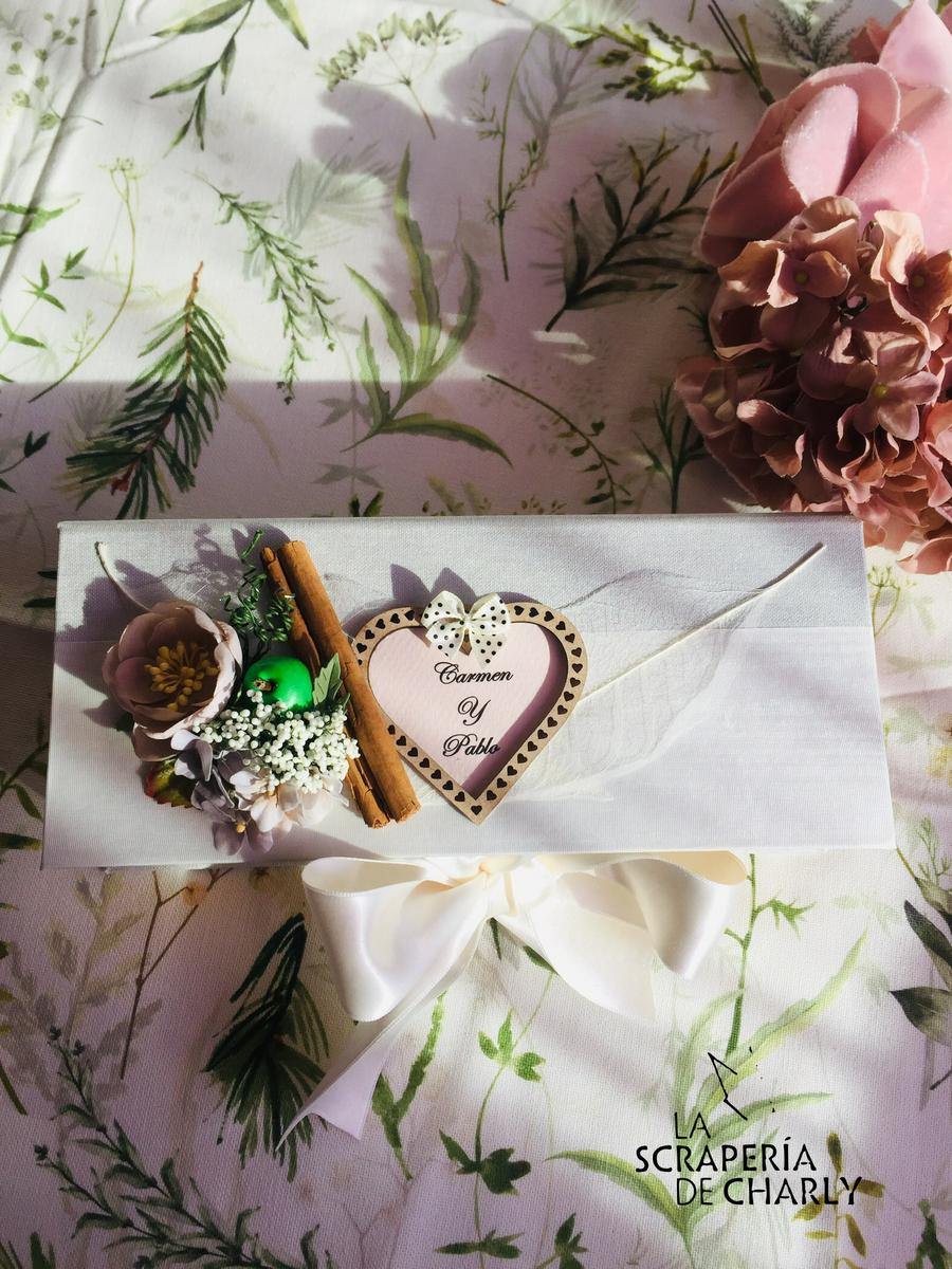 Nuestra caja para llevar las arras de boda esta hecha a mano, y decorada con un bouquet de flores, manzanas y ramas de canela, según decoración del evento de Carmen y Pablo. Formando un conjunto coordinado junto con el porta alianzas de regalos personalizados para tu boda.