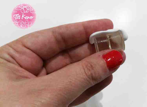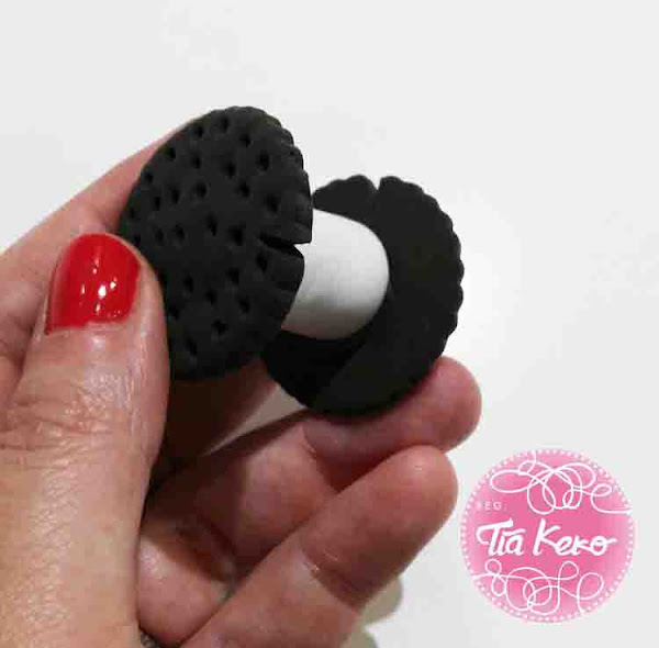 Ahora vamos a pegar con la ayuda de la pistola de silicona caliente, cada galleta en un extremo del tubito blanco y lo dejamos secar unas horas.