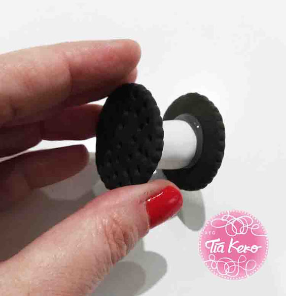 Para la parte central vamos a coger dos topes pequeños de puertas que teníamos por ahí danzando y los vamos a forrar de pasta de modelar blanca, de esta forma nos queda un tubito ancho al que pegaremos una galleta en cada extremo.