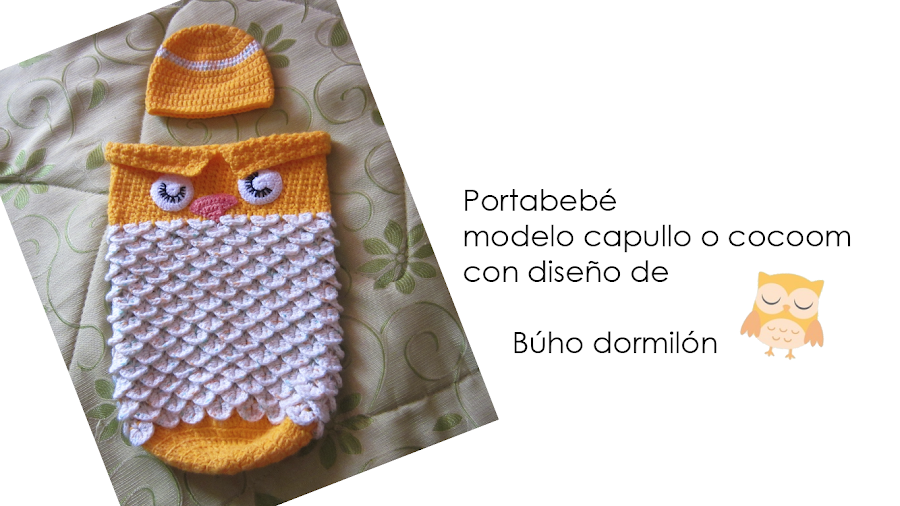 Es un lindo porta bebé con modelo de capullo y diseño de búho muy fácil de tejer.