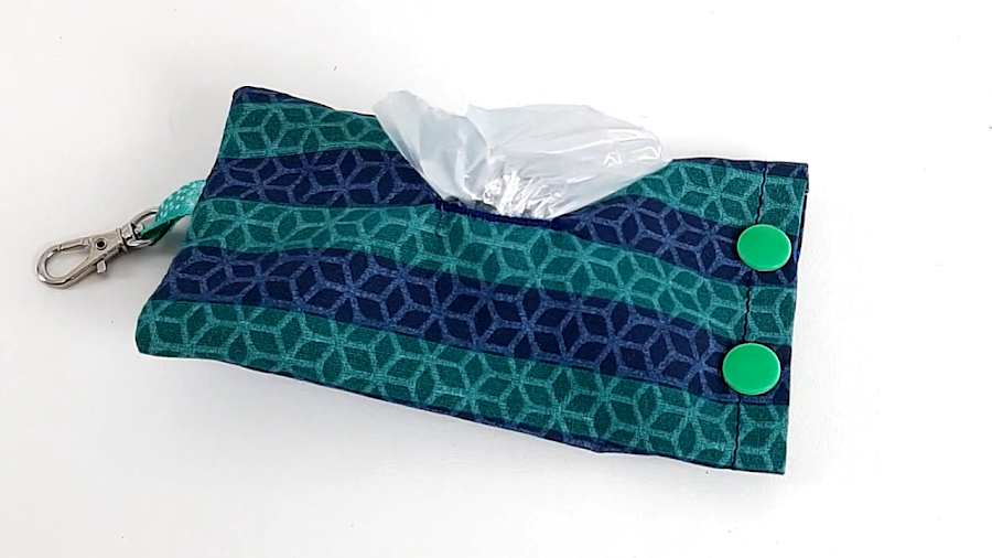 Ahora doblamos la tela de forma que el lado del revés quede a la vista y metemos la cinta con el mosquetón en la parte de abajo, así: