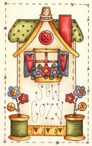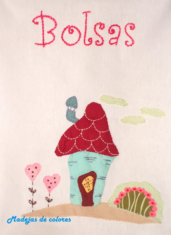 Me encantan los diseños de Eva Gustems, sobre todo las casitas, con ese estilo, entre naif y rústico. Así que ese fue el motivo que apliqué en la bolsa, con punto escondido y festón.