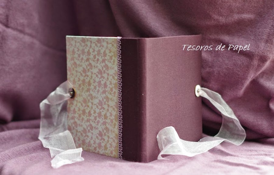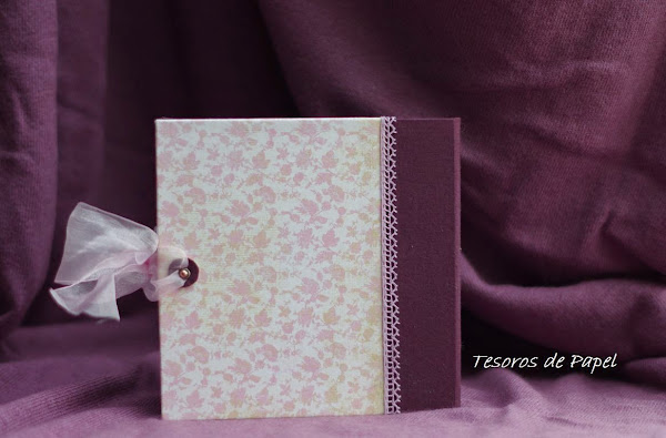 Este otro es un poco más sobrio e impersonal, aunque se podria personalizar con el nombre. Realizado en una tela color berenjena, con el rosa como color principal en la contraportada y el interior.