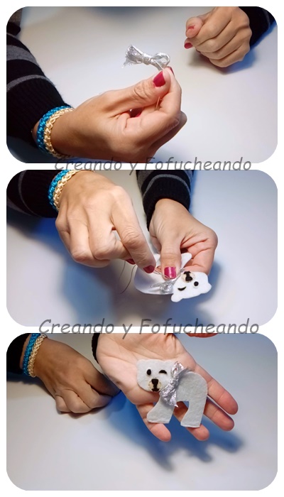 Total,que me gustó muchisimo como le quedaba ese lacito o moñito de cinta de tela decorativa navideña en el cuello,asi que un par de puntadas simbólicas en el centro y listo.