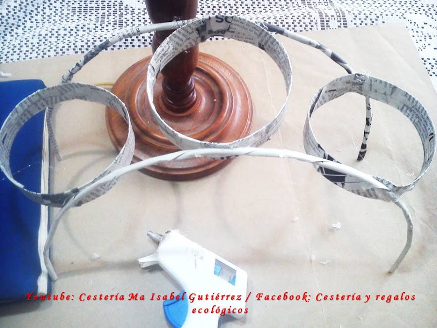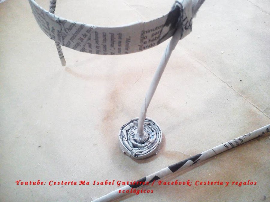 Las varillas de papel las hacemos con tiras de papel de diario de 10 cms., de ancho. Ponemos pegamento o cola blanca por una de las orillas y empezamos a enrollar con un palo de madera delgado por la otra orilla, acomodando este palo un poco inclinado...