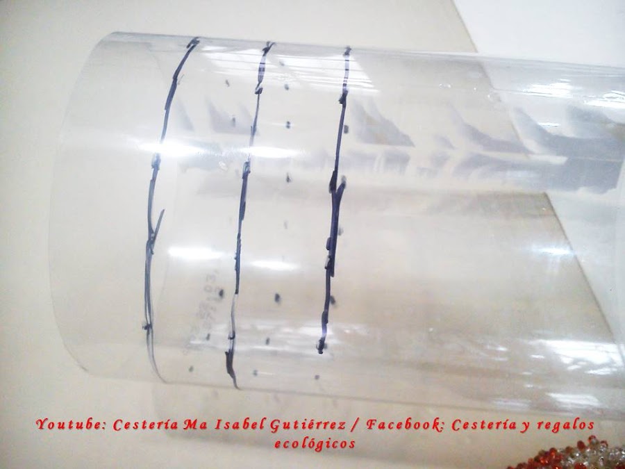 Necesitamos tres aros de la botella de plástico, para obtenerlos, medimos desde un extremo del tubo, dos centímetros hacia abajo, luego otros dos y finalmente otros dos, poniendo un punto o una marca que luego vamos a unir para que nos queden derechos y uniformes estos aros, cortamos con mucho cuidado con un cutter...