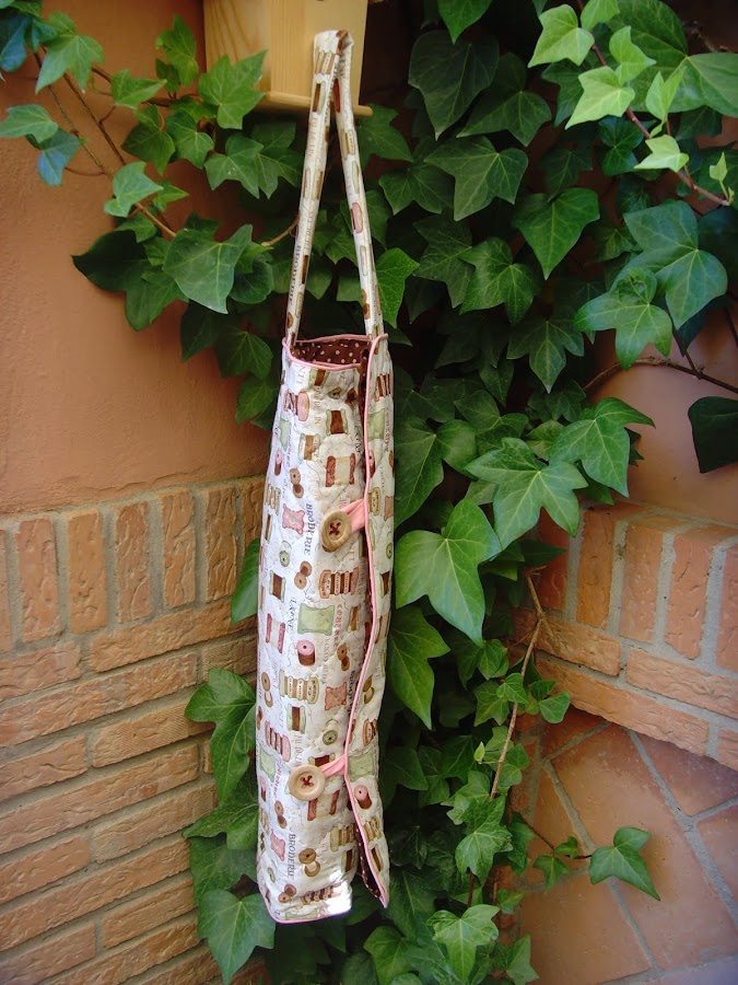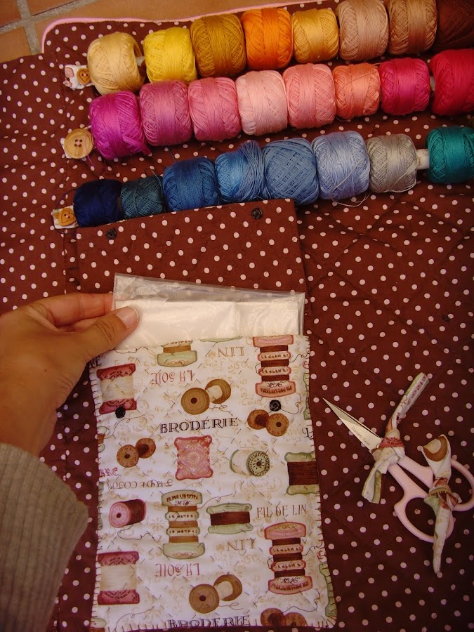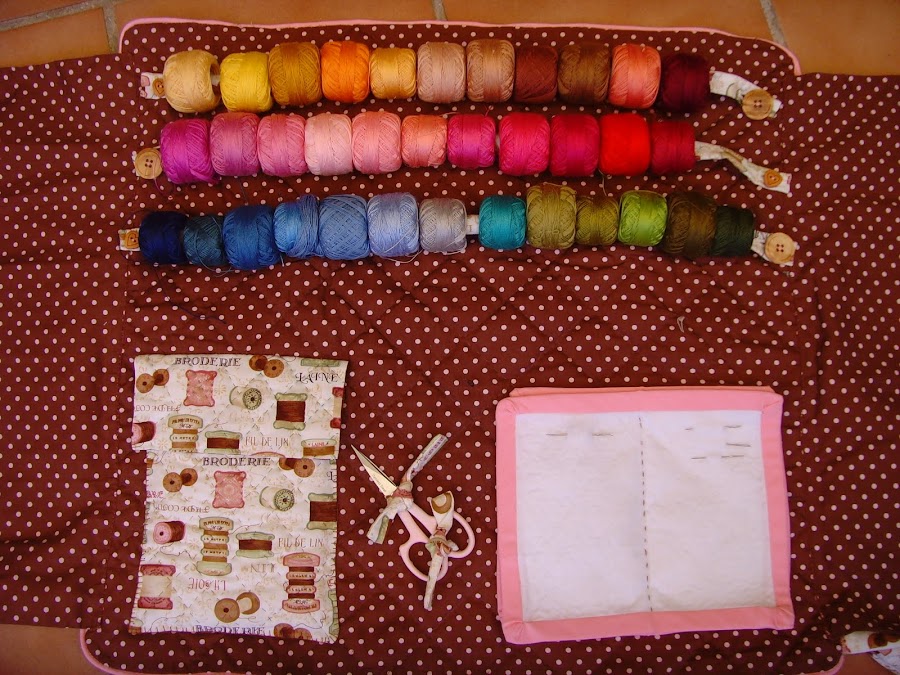 Así que aquí me teneis, con mi portabordados, lista para llevarme las labores al campo, a la playa, o simplemente al porche de casa, y así no tener que estar entrando y saliendo a por las cosas!