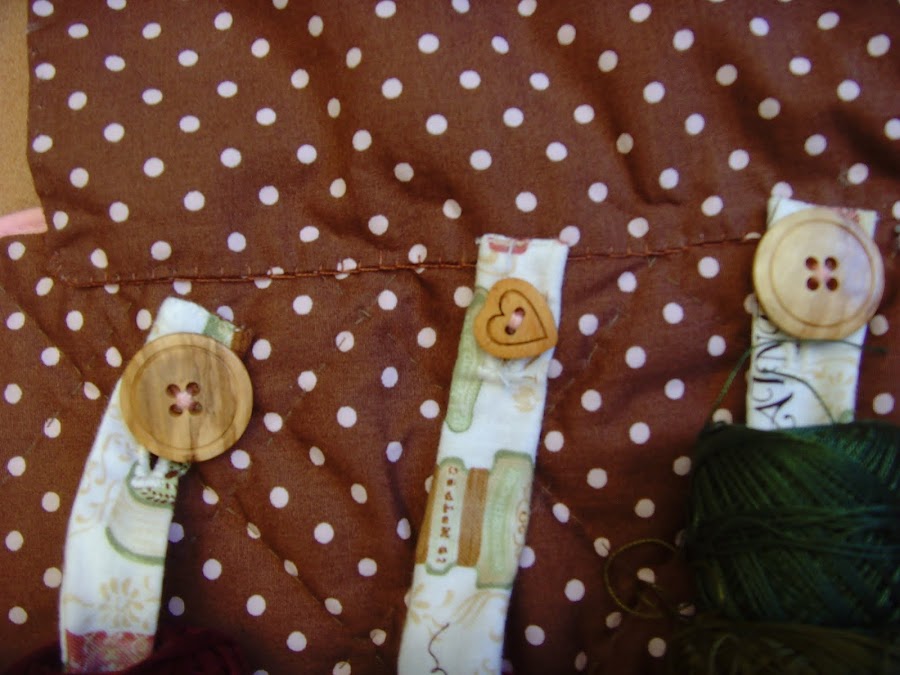 Para colocar los hilos le hice un hojal en cada extremo de los palitos forrados y luego puse cada botón en su lugar.