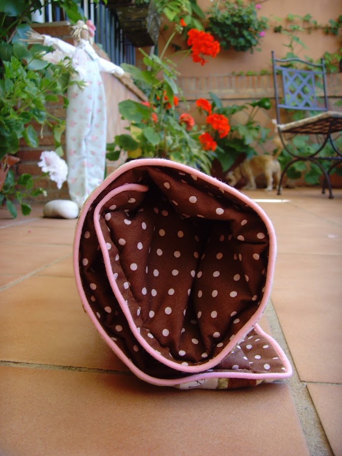Dos botones cierran el rolo con dos presillitas, y conforme desenrollamos descubrimos la telita interior en color chocolate y lunaritos rosa, a juego con el vivo exterior y las presillas.