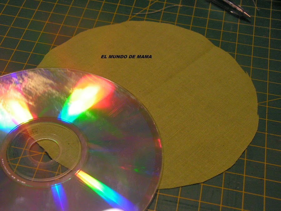 Cortamos el circulo de tela interiorcon 0,5cm mas grande que el cd