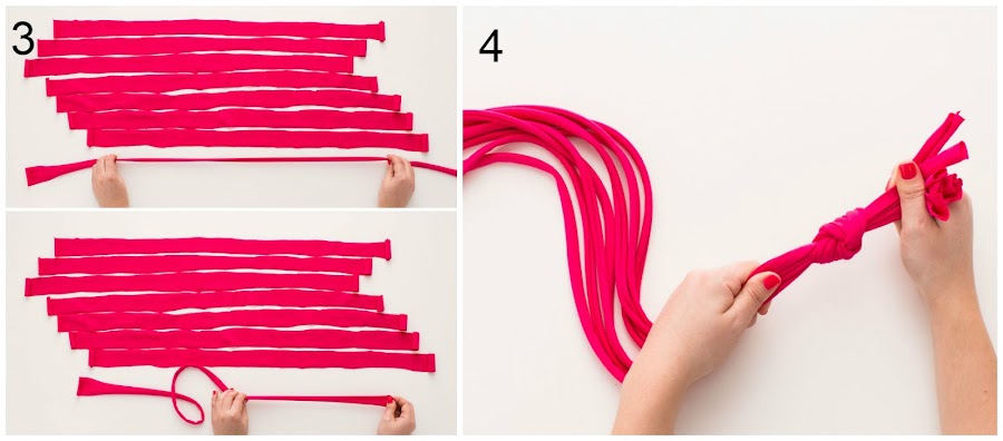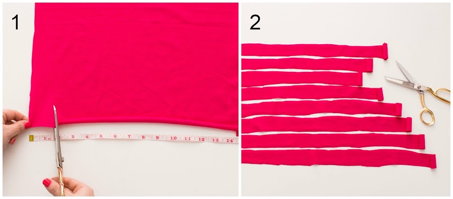 1.-2.- Reciclando tus camisetas o polos de algodón, corta tiras de 2 cm a lo largo, mientras mas largo sea, sera mejor.