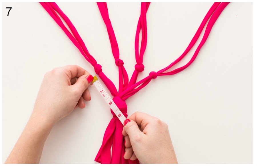9 y 10.-Con la técnica de macramé continua uniendo las tiras, haz los nudos de tal manera que vayas armando una red, checa la foto.