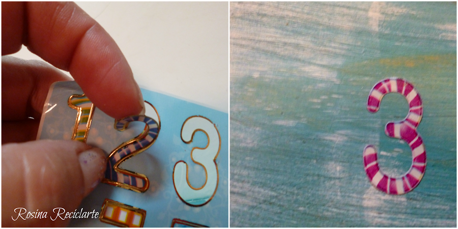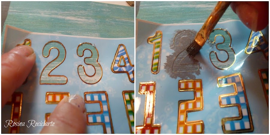 Como el número ya tiene adhesivo lo apliqué y pinté encima,en este caso con gris,y cuando secó retiré el stiker.