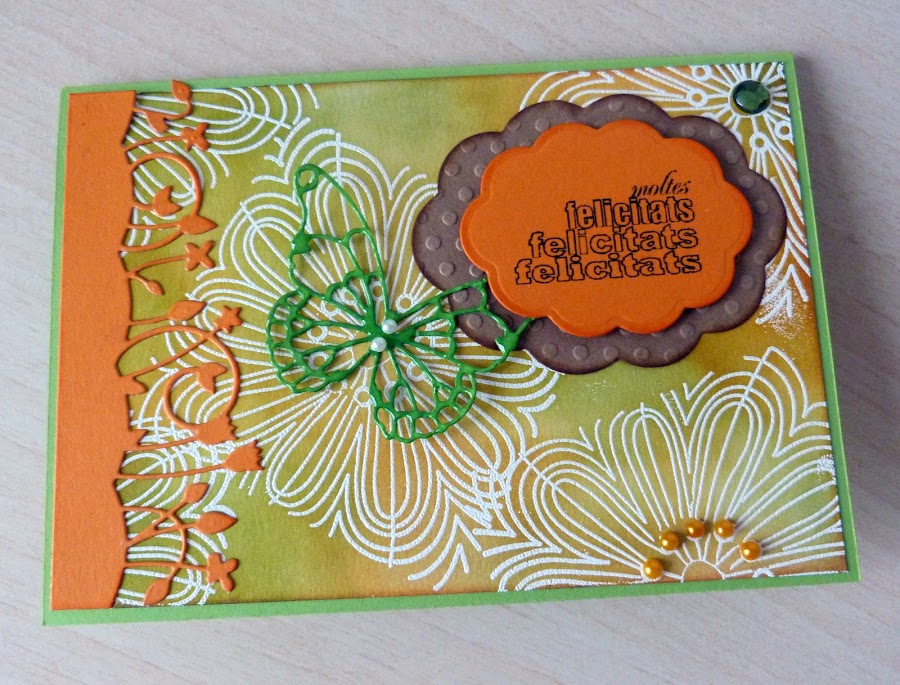 Cartulina base de color verde y con un sello de Prima he realizado la técnica resist que tanto me gusta como base de las tarjetas.