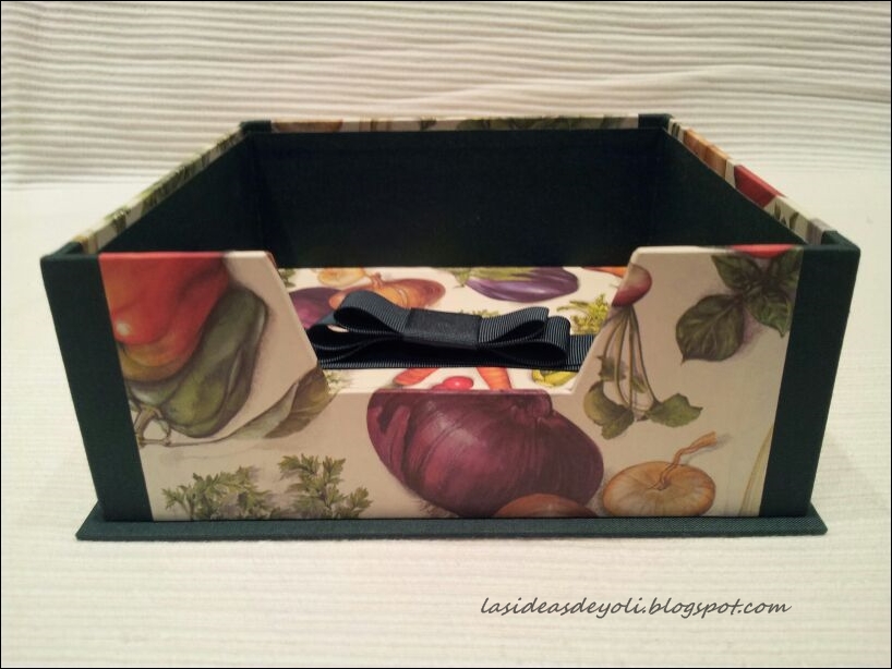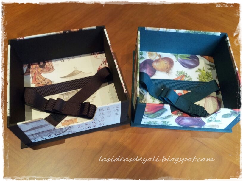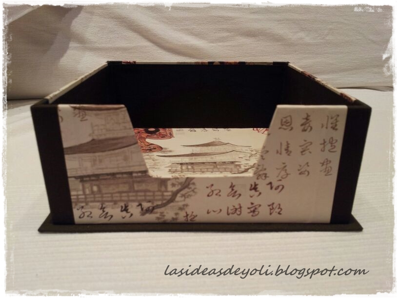 Esta vez son dos servilleteros, el primero esta confeccionado con tela de encuadernar en marrón chocolate y papel Tassoti con motivos orientales. Como detalle y para que no se muevan las servilletas una cinta en marrón con lazada . Tamaño 17*17 *6 .