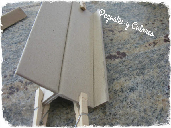 2.- Con pegamento pegue 2 piezas formando una T, y sujete con unos broches de ropa para que secara sin moverse, por unos 10 minutos antes de seguir.