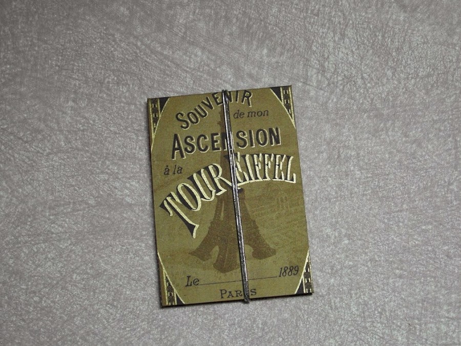 Yo he utilizado unos trozos de un bonito papel vintage con motivos de París para el exterior y un papel vinílico de fibras dorado para el interior. Para dar un toque de color elegí una cinta en tonos granates.