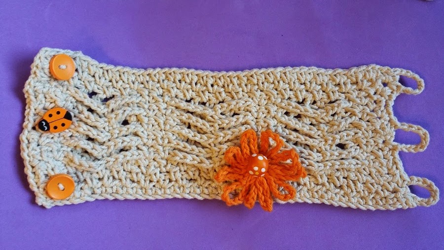 3 ojales y unos botones de madera naranja así como un motivo de flor, le dan alegría al conjunto Y QUEDA PERFECTAMENTE AJUSTADOA crochetear!!!!!!!!!!