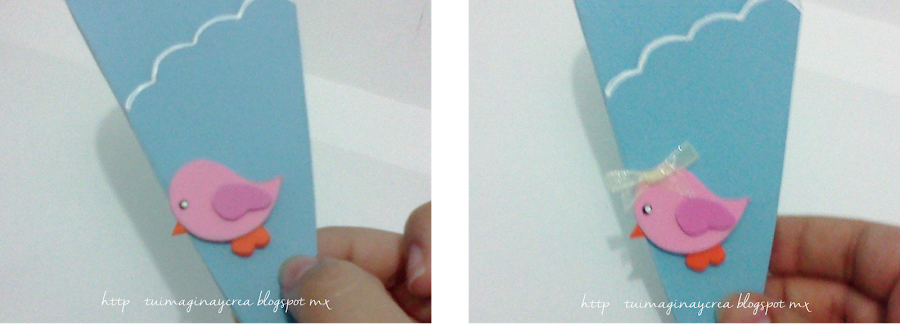 El listón lo ocupamos para hacer un moñito para este coqueto pajarito y lo pegamos.