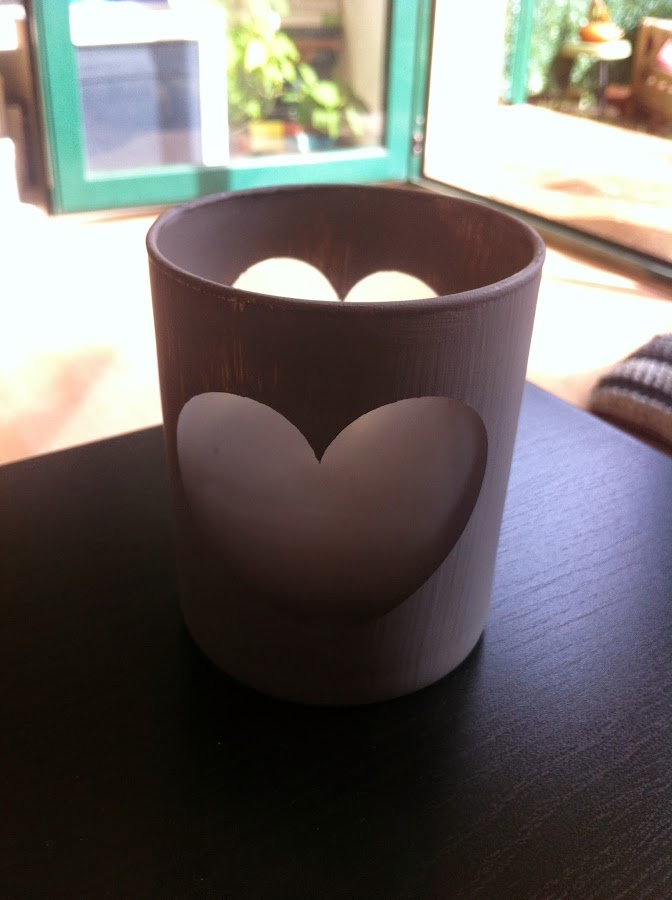 Una vez limpio, hay que pegar la silueta que queramos que tenga nuestro porta-velas (que será la que se iluminará cuando encendamos la velita). En este caso, yo he usado un par que tenía en forma de corazón. Si no tenemos ninguna pegatina, lo que podemos hacer es dibujar lo que queramos que destaque de nuestro porta-velas con un margen suficiente para que, al pintarlo, no nos salgamos del límite.