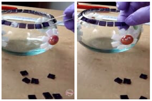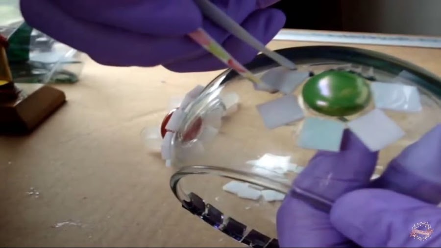 continuamos armando la flor, ponemos los cuadritos de vidrio por todo el contorno de la gema dejando una separación entre pieza y pieza, armamos cuatro flores, una en cada lado