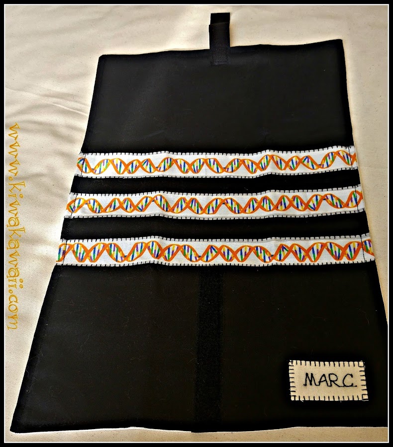 Con su nombre bordado para que no se pierda y una tira larga de velcro que ajusta a (casi)cualquier medida de bocadillo.