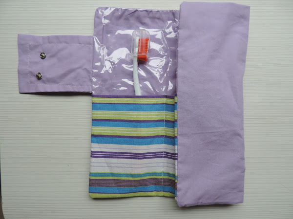 El porta cepillos de dientes está hecho con tela que tenía de muestrarios de una tienda de cortinas, que me regaló mi amiga Rosa, además está forrada con plástico por dentro, para que al meter el cepillo de dientes no se moje la tela.