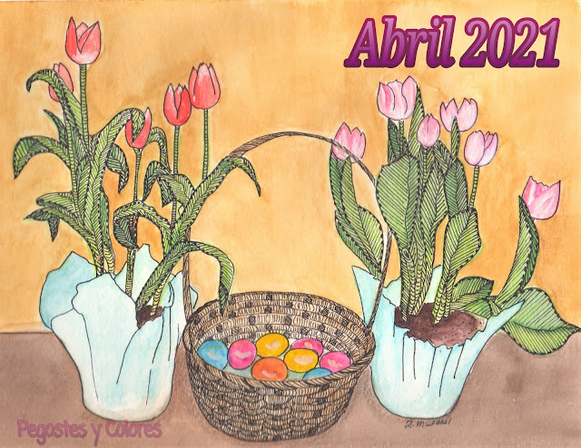 Para la portada o ilustración de Abril, decidí pintar dos macetas con tulipanes que compre junto a una canasta viejita en la que puse todos los huevos de pascua rellenos de sorpresas para la búsqueda tradicional.